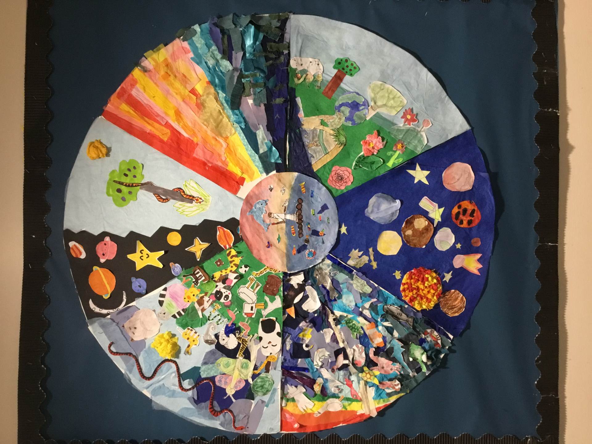 Year 5 have worked collaboratively to produce a wonderful collage wheel reflecting the creation story from the bible. Each segment represents a day of the creation story and is pulled together by 'God in his oasis' on the 7th day of rest. It is now on display in the Year 5 corridor for people to admire. Well done for working so hard on it Year 5!